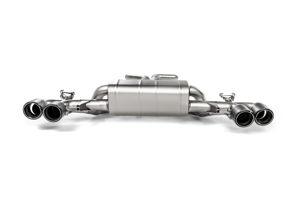 Cat-back, built from high-grade lightweight titanium – with some parts cast in Akrapovič’s own foundry – this system will reduce exhaust system's weight. Developed to deliver both power and torque gains throughout the range with most gain in lower rpm will improve responsiveness and drivability. The system delivers distinctly different sound from the stock system, most noticeable at shifting, backfiring and accelerating. The carbon-fibre tailpipes have been perfectly crafted and designed to fit beautifully within the optional carbon-fibre diffuser. Optional carbon-fibre mirror caps are also available to further enhance the car's appearance.