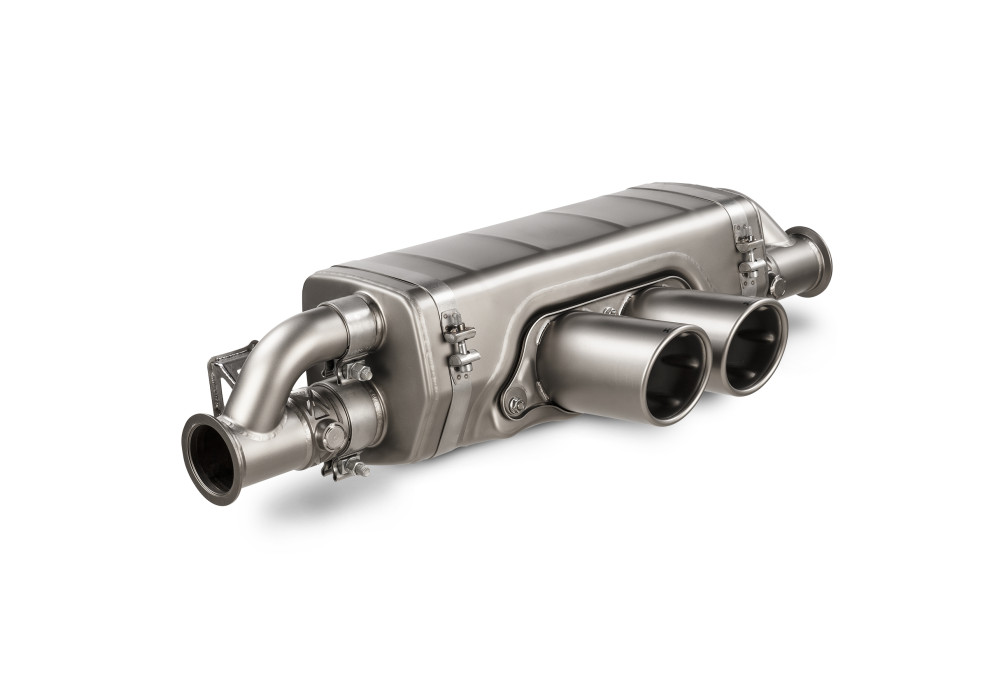 Developed solely for the 911 GT3 (992), this high-grade lightweight titanium system is sandblasted and coated for durability. The completely new design includes twin tailpipes, with the outer shell coated and the inner sleeve featuring six imprints to match the six-cylinder engine, with an engraved Akrapovič logo to complete the visual effect. The housing of the exhaust valves – which have been tailored perfectly to the gas flow to produce a smooth, rich tone at normal cruising and a sporty sound experience at higher revs – and the collectors in the muffler are cast in the Akrapovič in-house foundry. When combining the Slip-On Race Line (Titanium) with the Slip-On Race Line Adapter (SS), the weight is decreased by 20.7% (3.5 kg) against the standard system and performance sees an increase of 6.5 kW (8.8 hp) in power at 2,900 rpm and a torque rise of 24.1 Nm at 2,400 rpm when tested on the Akrapovič dyno against a Porsche 911 GT3 (992) with a standard stock exhaust. This system is intended for use on closed-course competition circuits only because it is a racetrack-oriented part. No remapping of the ECU is required.