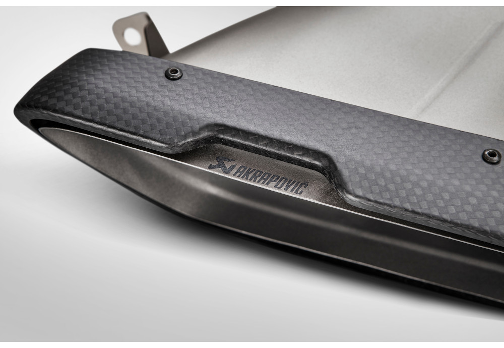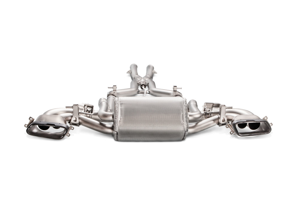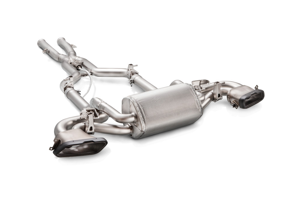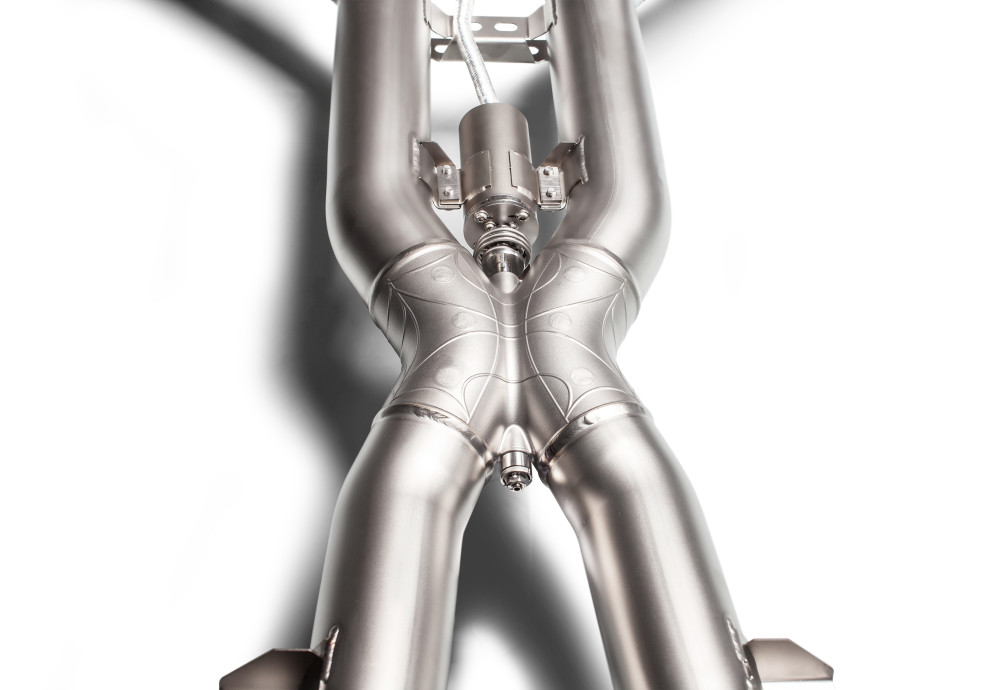 The Evolution Line (Titanium) takes these cars to heightened levels of auditory excitement, enhanced performance, and stunning good looks, all with a perfectly sculpted exhaust made from ultra-lightweight titanium alloys that reduce the weight from the stock exhaust by over 46%. Finished with hand-crafted carbon-fibre tailpipes, this exhaust has a stunning soundtrack and that unique Akrapovič signature. The sound is controlled by a complex X-connection, cast in the in-house titanium foundry, with a precisely machined valve flap to alter the tones, which can be controlled with a console button inside the cabin or by the Sound Remote Controller of the optional Akrapovič Sound Kit. When the X-connection valve is open, the exhaust system delivers a more continuous, smooth, and harmonic sound for a more comfortable ride, and in closed mode the acoustics have been maximised to give the cars a pure sporty and intense muscle-car V8 roar. Power and torque levels are increased throughout the entire rev range. It is ECE approved, so no re-map or other parts are needed and it is a simple plug-and-play installation.