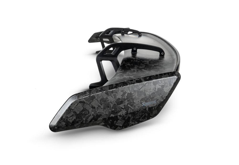 Fully adjustable to three levels, the wing needs to be manually set to the preferred angle before driving. It is ABE approved with AKR-WI KBA 31882 type approval and finished with an understated Akrapovič monochrome logo on each side.