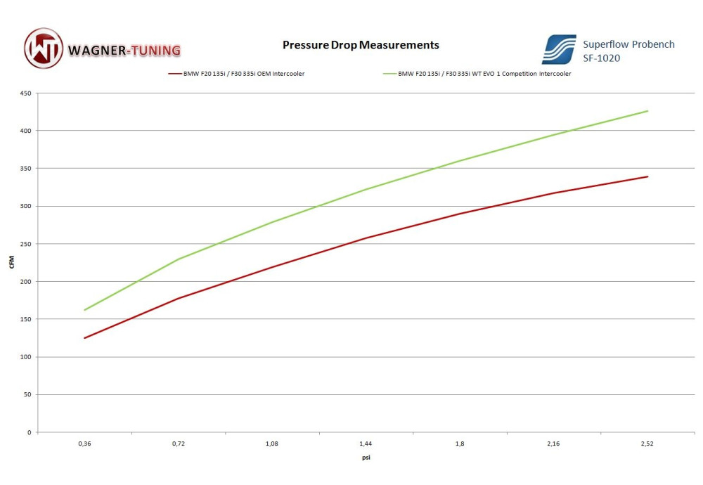 Wagner Tuning intercooler has net dimensions of 520x210x130 (11,750 cc) and offers an amazing 64% larger flow area and an impressive 60% more charge air volume compared to the factory intercooler. Feel the increased power and improved acceleration.