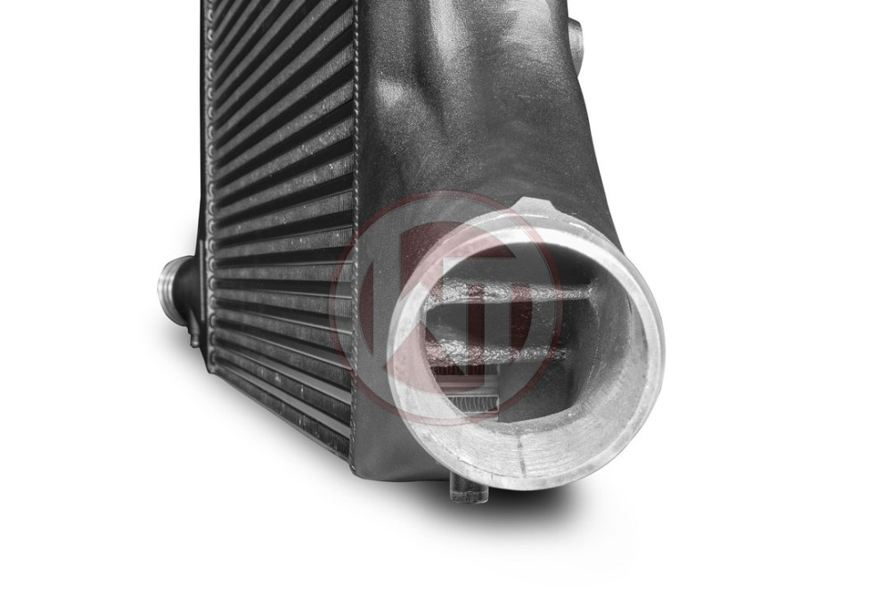The Competition Intercooler has the following core dimensions (550mm x 445mm x 70mm = 17.130cm³). The high performance intercooler core provides a 134% larger frontal area and 105% more volume compared to the stock mounted intercooler. Our engineers have increased the intercooler core size and efficiency, as well as improved the endtank design to remove any OEM bottlenecks, resulting in increased flow rating and charge cooling properties. We use our award winning WAGNERTUNING Competition Intercooler Core which is made specifically for this application. Constructed of the highest quality Tube Fin intercooler cores with inside turbulators combined with cast aluminum endtanks optimized by CFD for best possible internal airflow.
