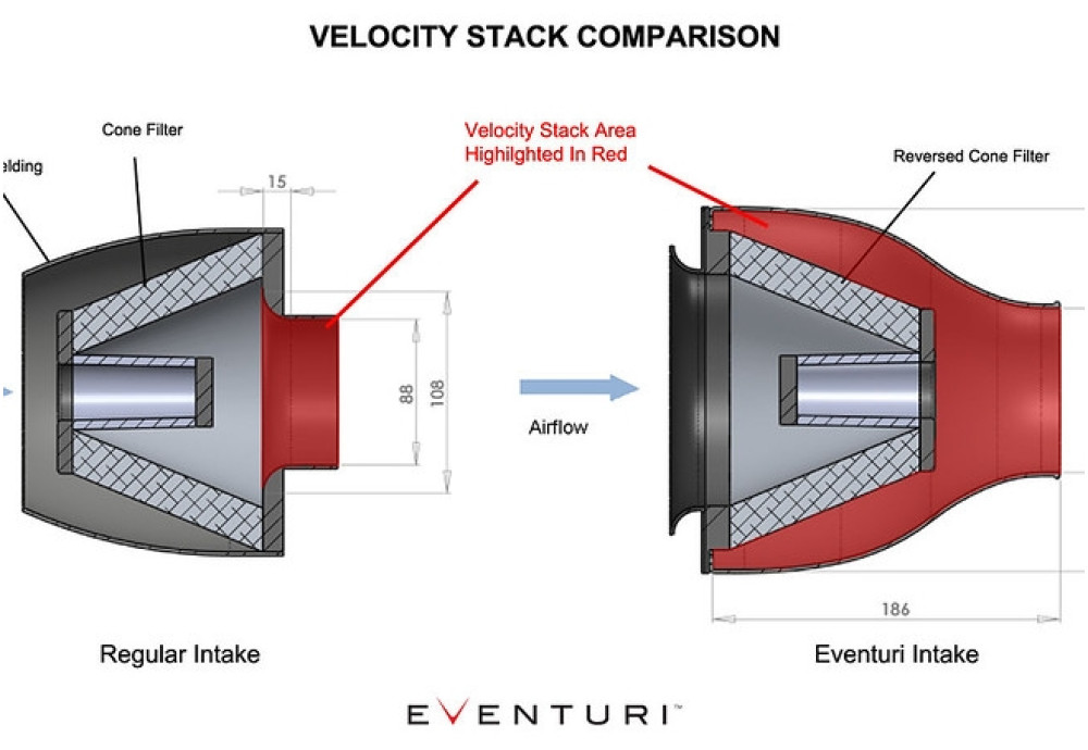 The filter housings comprise of the high flow filters, aluminium cowls and the carbon pods themselves. The carbon pods shroud the reverse mounted filter and smoothly shape the airflow down to the MAF tubes. This smooth reduction in cross sectional area invokes the Venturi effect where the airflow accelerates whilst maintaining laminar conditions. It can be thought of as a large velocity stack - below is a diagram to show the comparison between our patent pending design and a regular intake system. Our bespoke filters aid the airflow moving through the housings and allow for an even velocity profile as the airflow exits the housings. Further details can be read in the Technology and Filters pages.