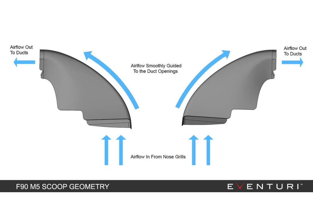 Unlike most aftermarket "scoops" the Eventuri Scoops have been designed extend from the stock duct openings all the way to the grills. In order to capture as much air as possible, the scoops are shaped to the same contours as the outsides of the grills and then smoothly channel ambient air through a continuous curve to the duct openings.