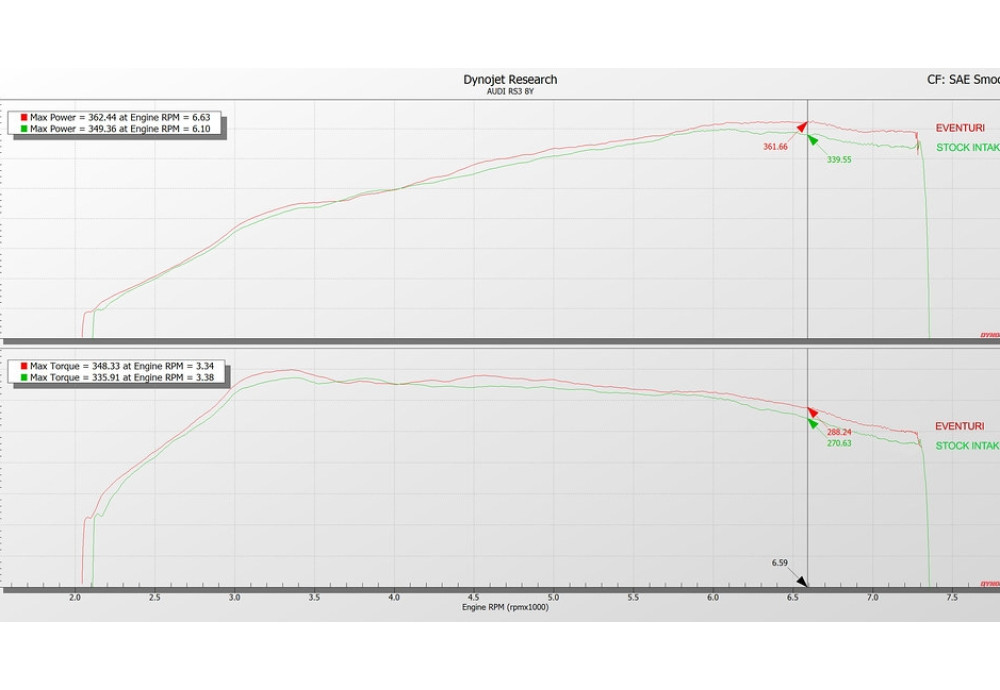 Our RS3 Intake has been tested by various reputable tuners globally who have been building high powered RS3 projects for road and track use. The first set of results are from MSL Performance who tested our system on a stock RS3 8Y. Tests were done on the same day back to back. As can be seen, there is a measurable gain throughout the RPM range of up to 22hp. This gain even on a stock car is noticeable on the road with better throttle response and quicker acceleration.