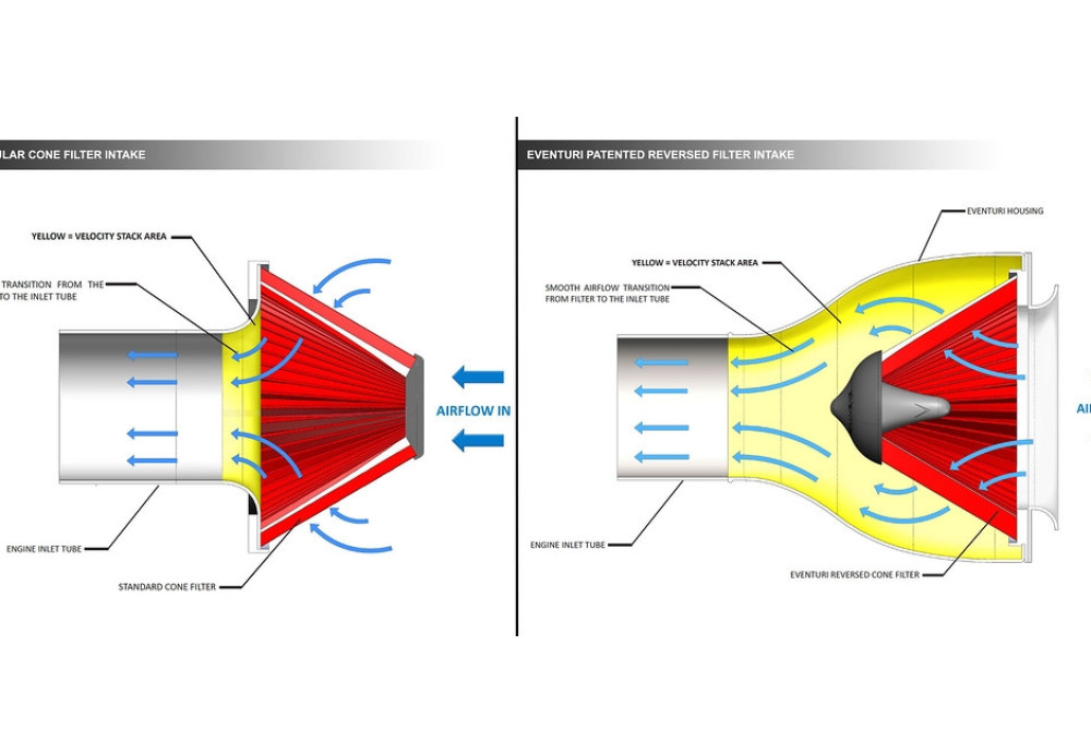 The Stage 3 filter housing comprises of a bespoke high flow filter, aluminium cowl, laser cut brackets and the carbon pod itself. The carbon pod shrouds the reverse mounted filter and smoothly shape the airflow down to the intake tubes. This smooth reduction in cross sectional area invokes the Venturi effect where the airflow accelerates whilst maintaining laminar conditions. It can be thought of as a large velocity stack - below is a diagram to show the comparison between our patented design and a regular intake system. Further details can be read in the Technology page.