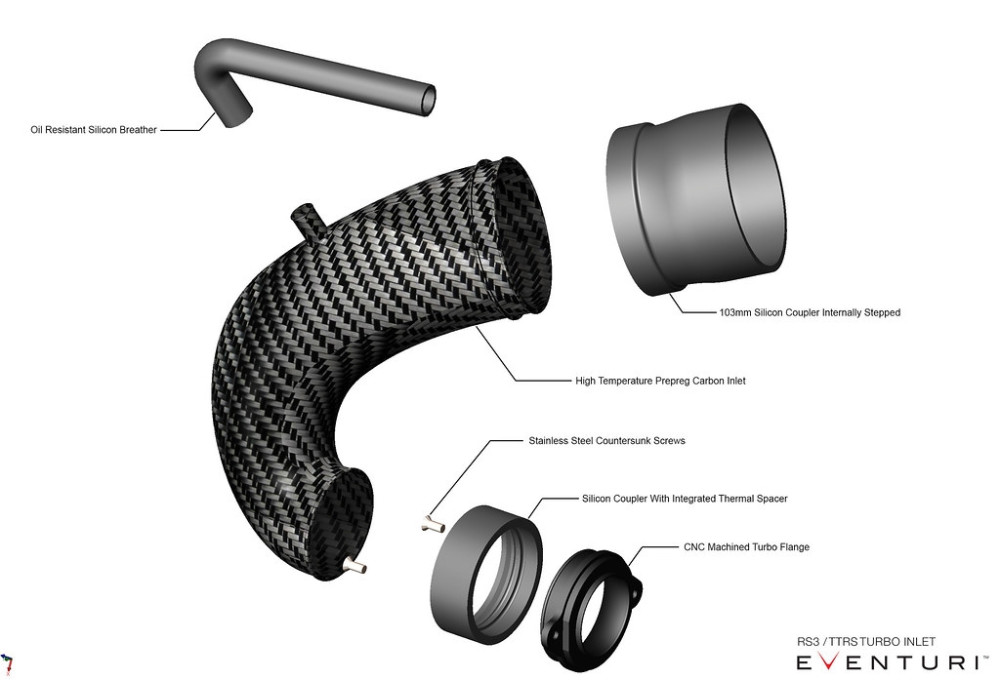 The Eventuri TTRS FV Turbo Inlet is manufactured from high temperature prepreg carbon fiber and come with a number of other components engineered to perform a specific purpose and fabricated to the highest of standards.