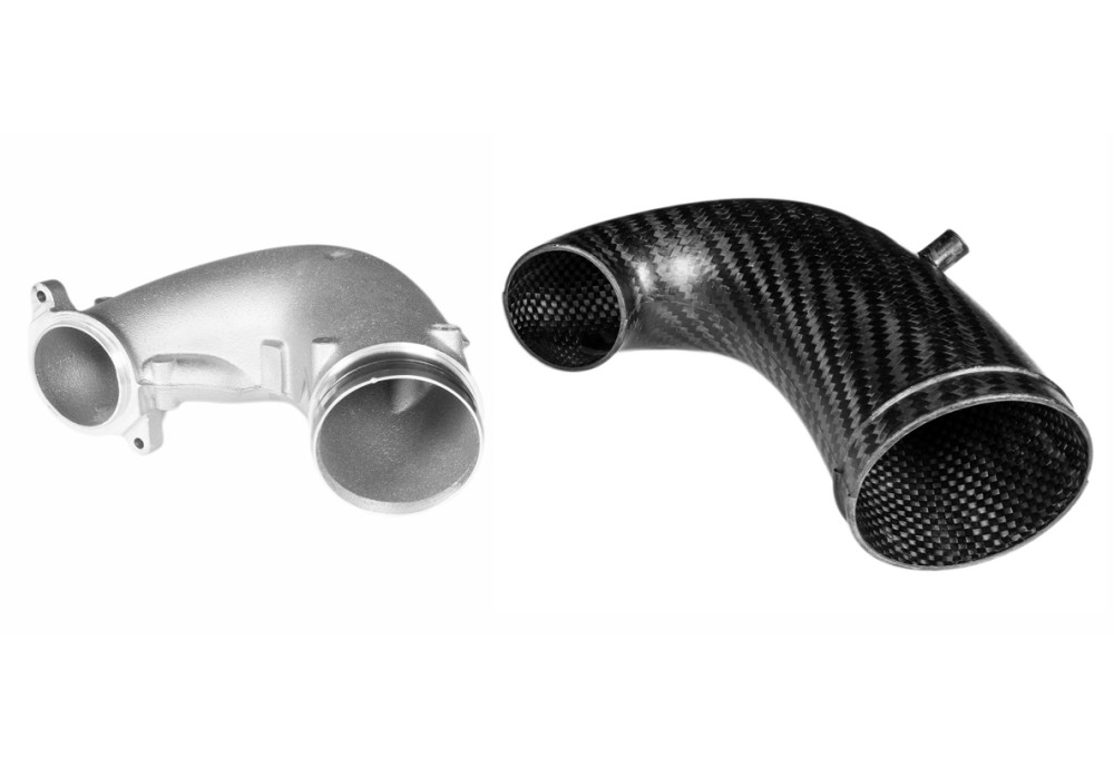 Our Turbo Inlet provides a smooth flow path from the 103mm diameter inlet to the 74mm outlet to the turbo flange. We designed the shape with a continuous curvature and maximised the internal volume without affecting the airflow negatively. The inlet is finished in raw carbon so has no clear coat - which would not be able to withstand the heat generated from the turbo and exhaust manifold. The carbon construction allows us to keep the inside flow surface smooth which helps with reducing the surface friction and in turn allows airflow to move easier. We ensure strength and rigidity by maintaining a 2mm wall thickness throughout the part. Finally for added protection there is a heat reflective layer applied where the tube crosses the exhaust manifold. This reduces the radiant heat absorbed by the tube. The advantage of using carbon fiber over the traditionally used cast aluminium is mainly down to the thermal conductivity and the ability to keep the inside smooth. The table below summarises the advantages.