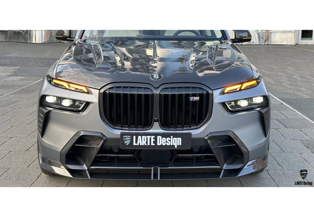 Larte Performance body kit for BMW X7 G07 LCI models from 2022 in Luxury and M Sport trims. The exterior tuning parts will transform the style of your BMW and add a sporty aggression to it. Each detail is handmade by Larte Design's designers and engineers and can be made from 100% carbon or premium composite material based on basalt fiber and painted in Glossy black or real Carbon Fiber.