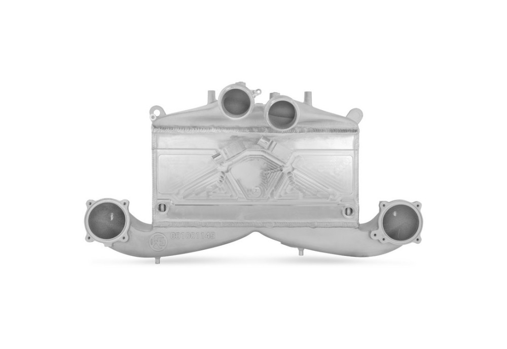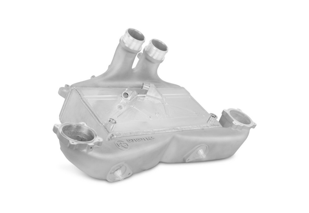 We're revolutionizing lightweight design with our intercoolers, weighing only 12.6 kg each. Crafted using CAD-developed free-form end boxes from high-quality cast aluminum, they ensure optimal internal airflow and impressive pressure resistance of up to 6 bar (tested). Our reinforced silicone hoses and aluminum charge air tube offers exceptional flow characteristics while maintaining high pressure resistance. This approach effectively minimizes back pressure, maximizing your vehicle's performance to its fullest potential.