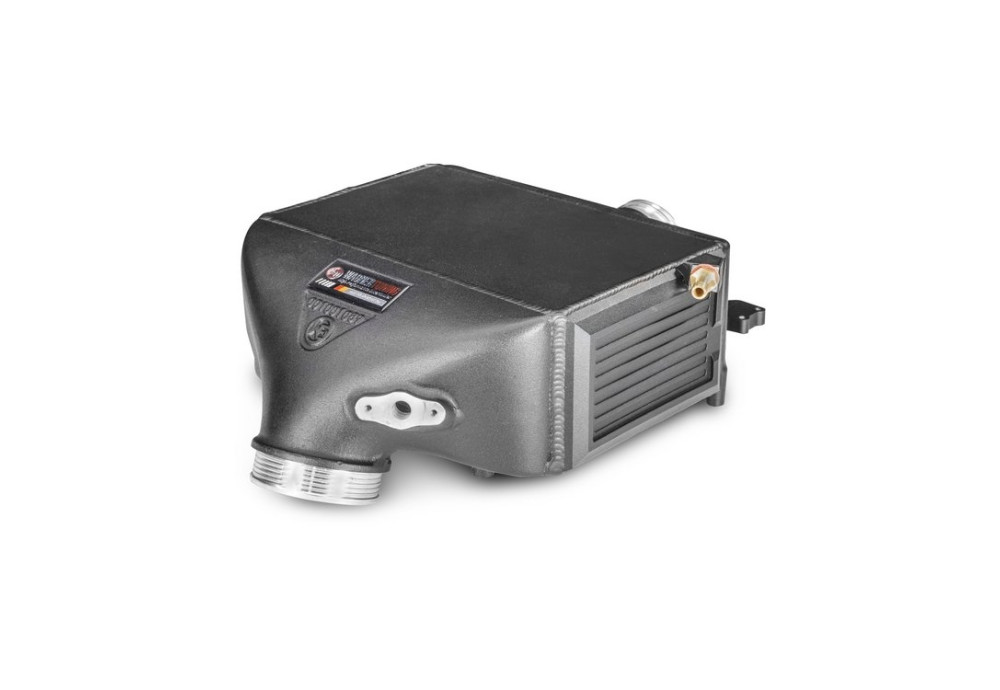 The 3.0 Liter S55B30 turbo engine of BMW M2 Competition is equipped with an indirect charge-air cooling circuit. So the cooling of the charged air is realized by a watercooled intercooler which will be replaced by this WagnerTuning high-performance intercooler.