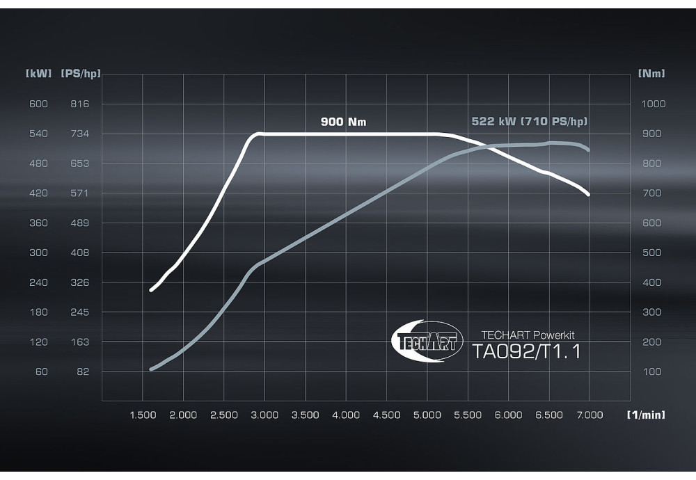 Porsche 911 Carrera S/4S 3.0 l Techart Techtronic Power enhancement +44 kW (+60 hp) Torque increase +100 Nm Total power output 522 kW (710 hp)/900 Nm