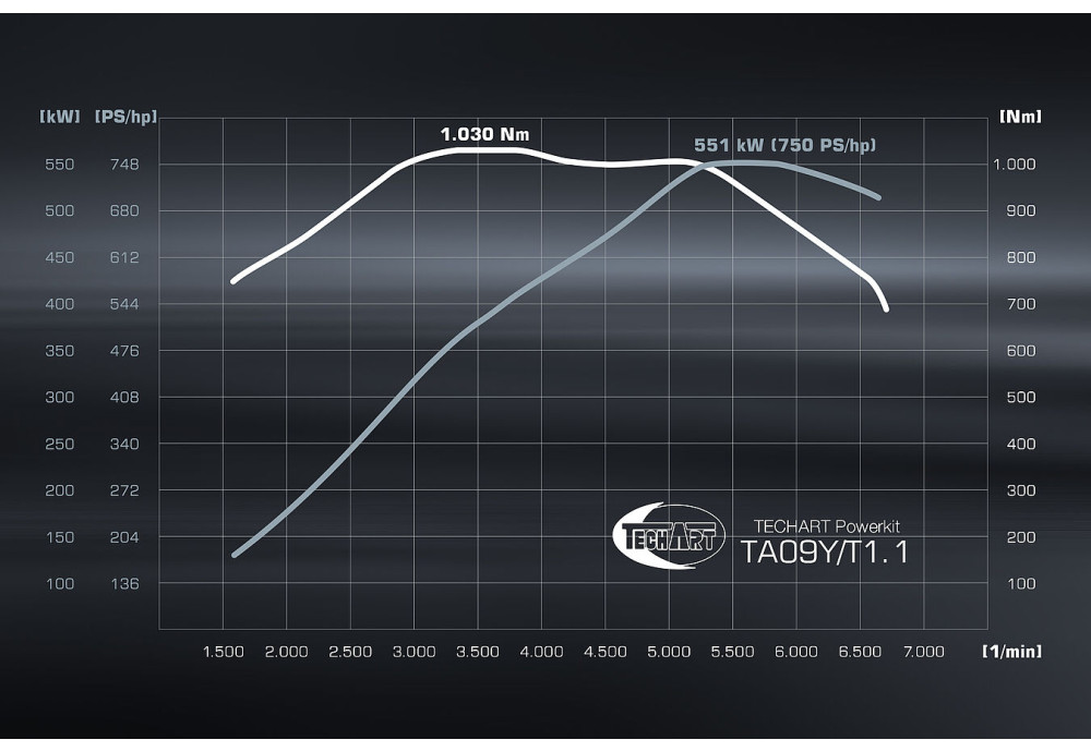4.0 l Porsche Cayenne Turbo engine, 500 kW (680 hp) / 900 Nm Power enhancement +51 kW (+70 hp) Torque increase +130 Nm Total power output 551 kW (750 hp), 1,030 Nm