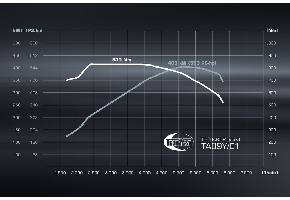 Porsche Cayenne V6 3.0 l E-Hybrid Techart Techtronic Power enhancement +65 kW (+88 hp) Torque increase +130 Nm Total power output 405 kW (550 hp), 580 Nm (max. torque combined: 830 Nm)