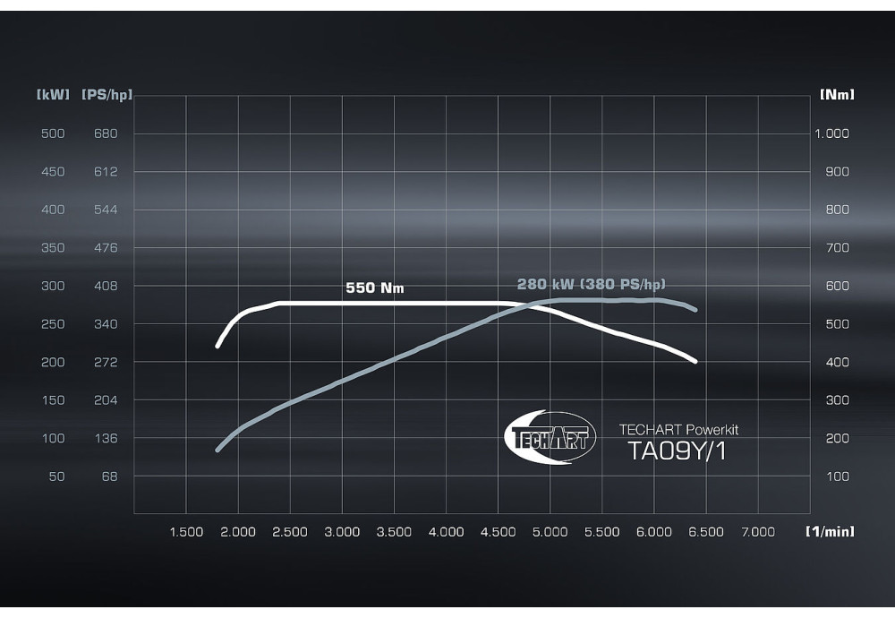Porsche Cayenne V6 3.0 l Techart Techtronic Power enhancement +29 kW (+40 hp) Torque increase +100 Nm Total power output 279 kW (380 hp), 550 Nm
