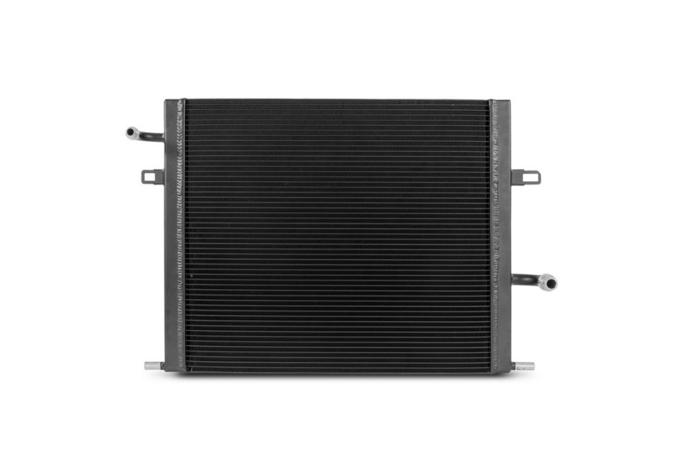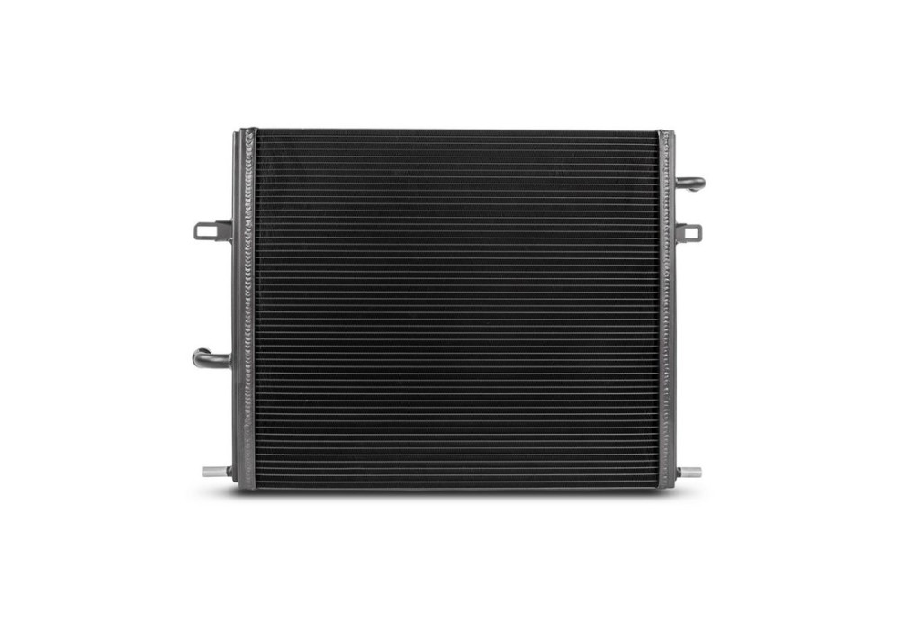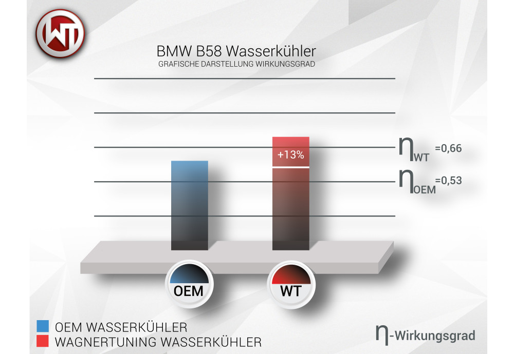 The 2.0 Liter B48B20 and 3.0 Liter B58B30M0 turbo engine of the specified BMW models is equipped with an indirect charge-air cooling circuit. So the cooling of the charged air is not realized by the ambient air as cooling medium (as usual), but made with its own cooling water circuit. A reduction of the temperature of the cooling water is directly equated with an improved cooling performance of the charged air. This is exactly where the advantages of the WAGNER TUNING upgrade radiator comes into play. The new developed competition racing core of the WAGNER TUNING high performance radiator increase the radiator volume of the OEM water cooler by a total of 117 %. The calculated ratio between the inner and outer cooling surface generates a maximum heat transfer and allows at the same time enough air flow for the surrounding components (for example the engine radiator) for its own heat exchange. Furthermore, using an increased amount of cooling water, the entire system thermics can be kept at a lower level over a longer period of time.