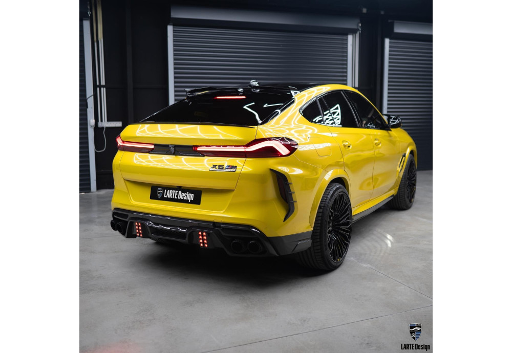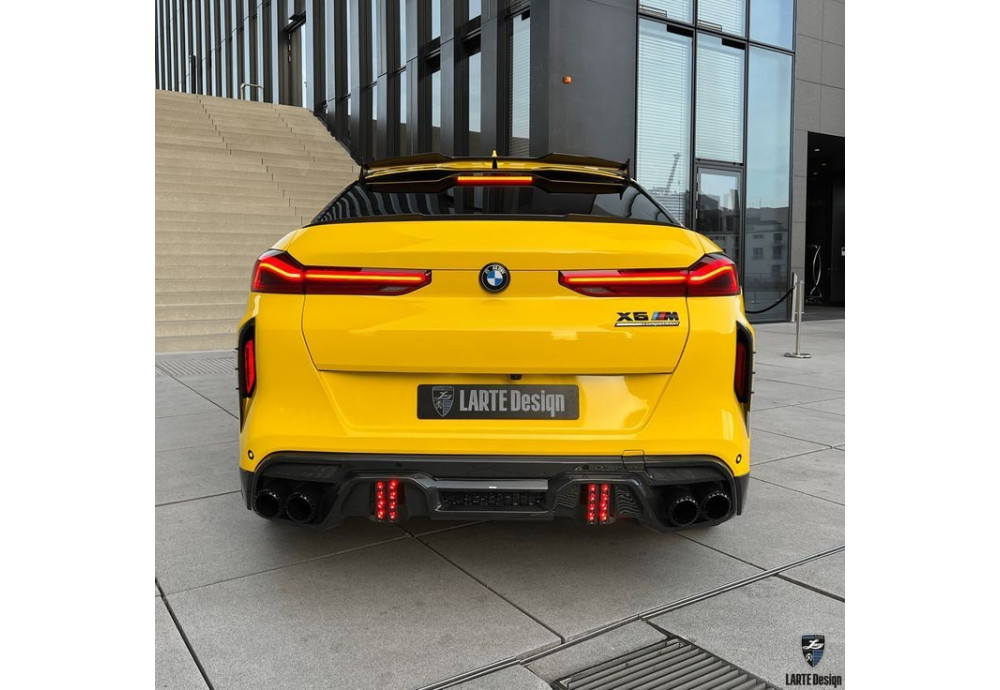 The aerodynamic Larte Performance body part`s gives the BMW X6M Competition F96 a more aggressive and powerful look. The Larte diffuser with additional stop lights and custom exhaust tips adds to the aggressive look, while the front lip adds sportiness and dynamism to the BMW X6M .
