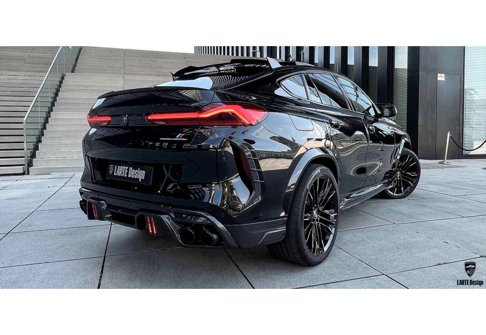 The aerodynamic Larte Performance body part`s gives the BMW X6M Competition F96 a more aggressive and powerful look. The Larte diffuser with additional stop lights and custom exhaust tips adds to the aggressive look, while the front lip adds sportiness and dynamism to the BMW X6M .